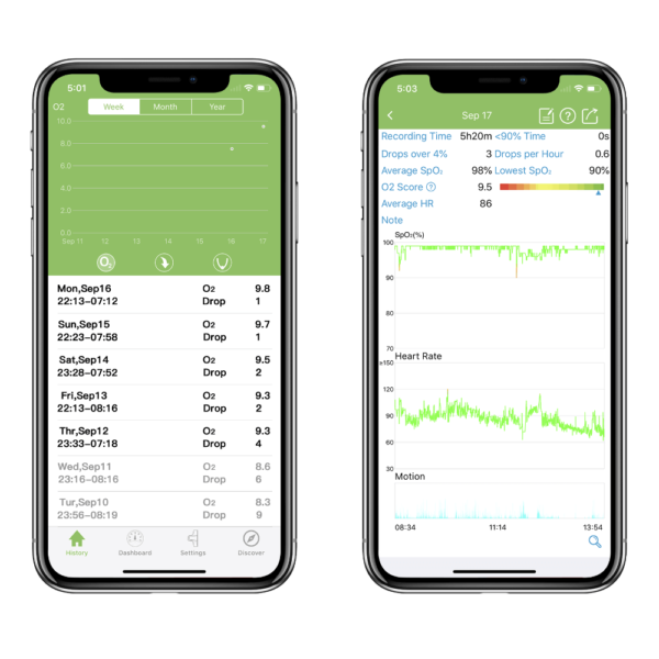 • Automatically detects and records the oxygen saturation (SpO2), heart rate, and body movements every second during sleep and daily life.