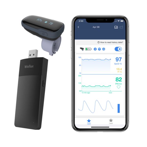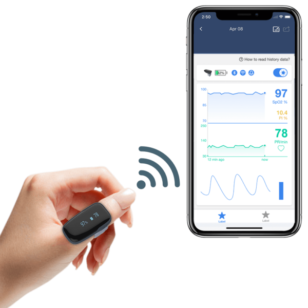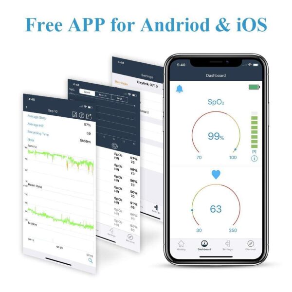 - Free iOS/Android APP with unlimited storage. View real-time blood oxygen and heart rate, record and track your long-term data, check detailed history analysis, share reports with your doctor.